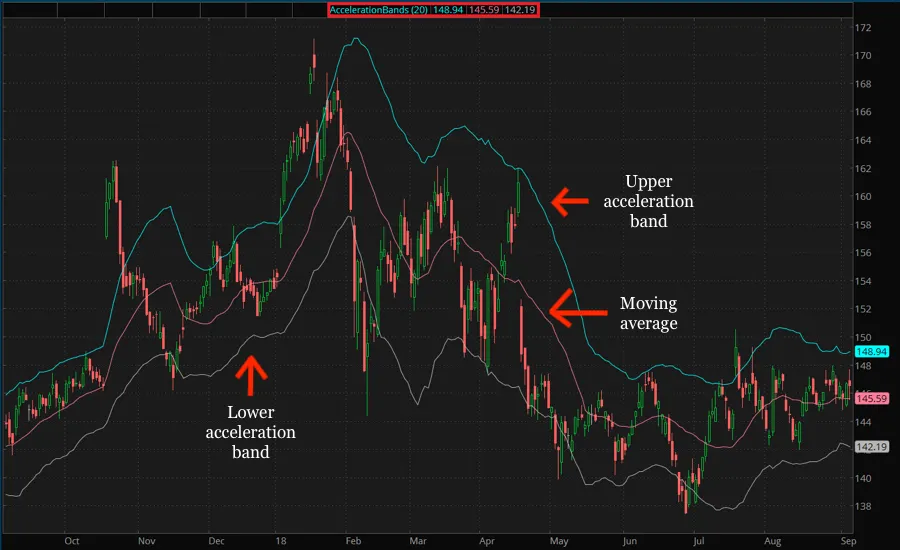 Acceleration bands are a technical indicator that help you define trends and measure the volatility of a security.